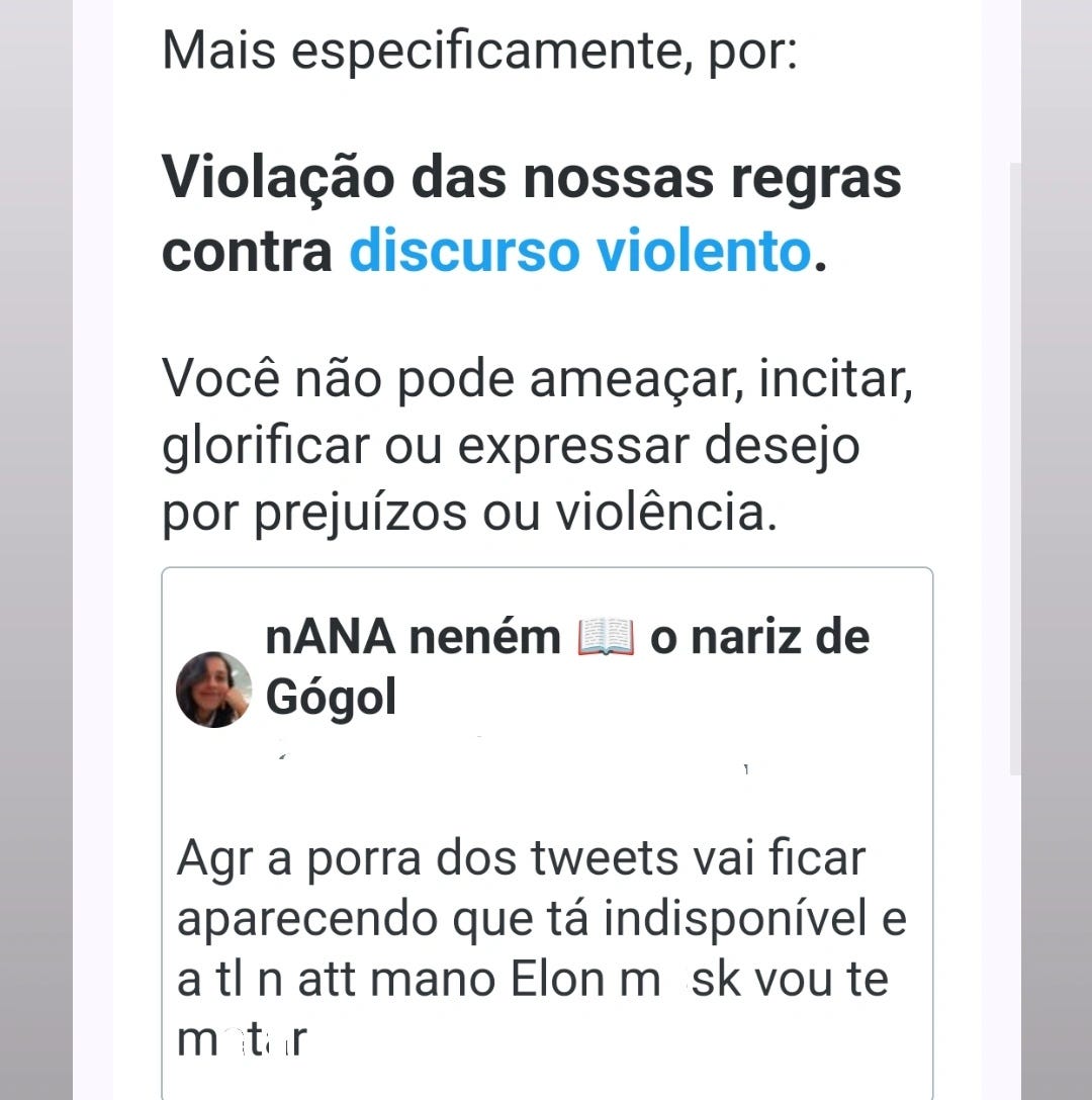 Acordo na quarta retrasada pra tomar remédio. Desligando o alarme, percebo a notificação de um E-mail do Twitter, o novo X. Conta suspensa. Estou com sono, volto a dormir. Descubro que estou com a conta suspensa por ter violado uma das regras contra violência do site. Em umas semanas atrás a timeline congelou e não atualizava direito, os tweets sumiam e muita gente reclamou dessa mesma maneira que eu: